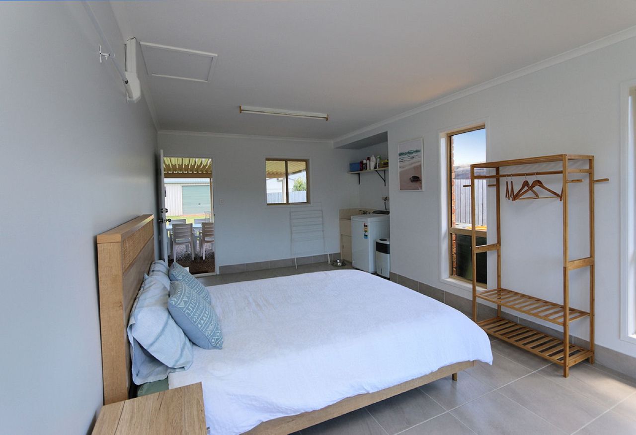 Your pets are welcome to enjoy the fully fenced yard, which provides ample room for play. The main bedroom boasts a king-sized bed and air conditioning for your comfort, while the second bedroom has a queen bed and air conditioning as well. The third bedroom is perfect for younger guests, featuring a single bed, a cot, and a change table. The fourth bedroom, which has its own entrance, includes a queen bed, air conditioning, and conveniently hides the laundry facilities in the corner.