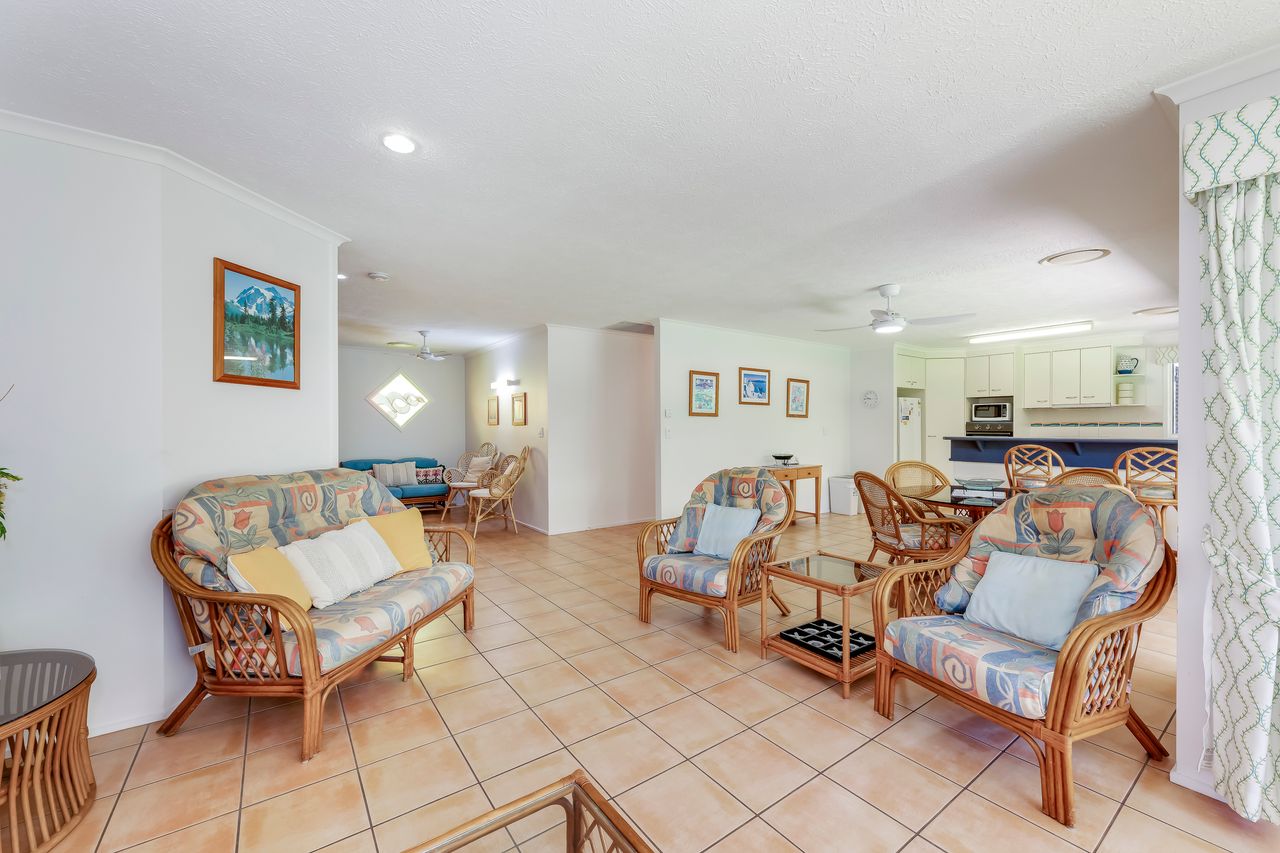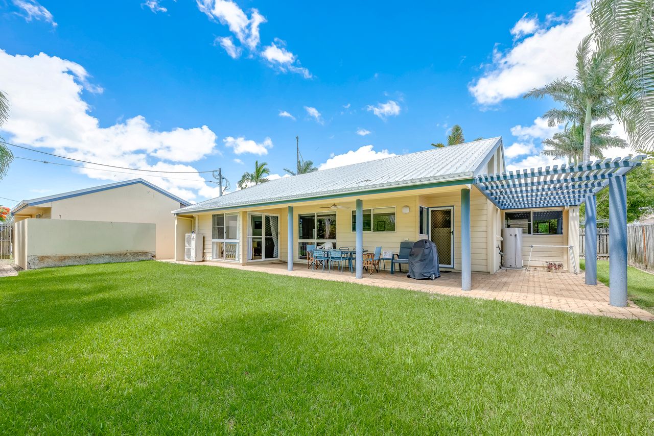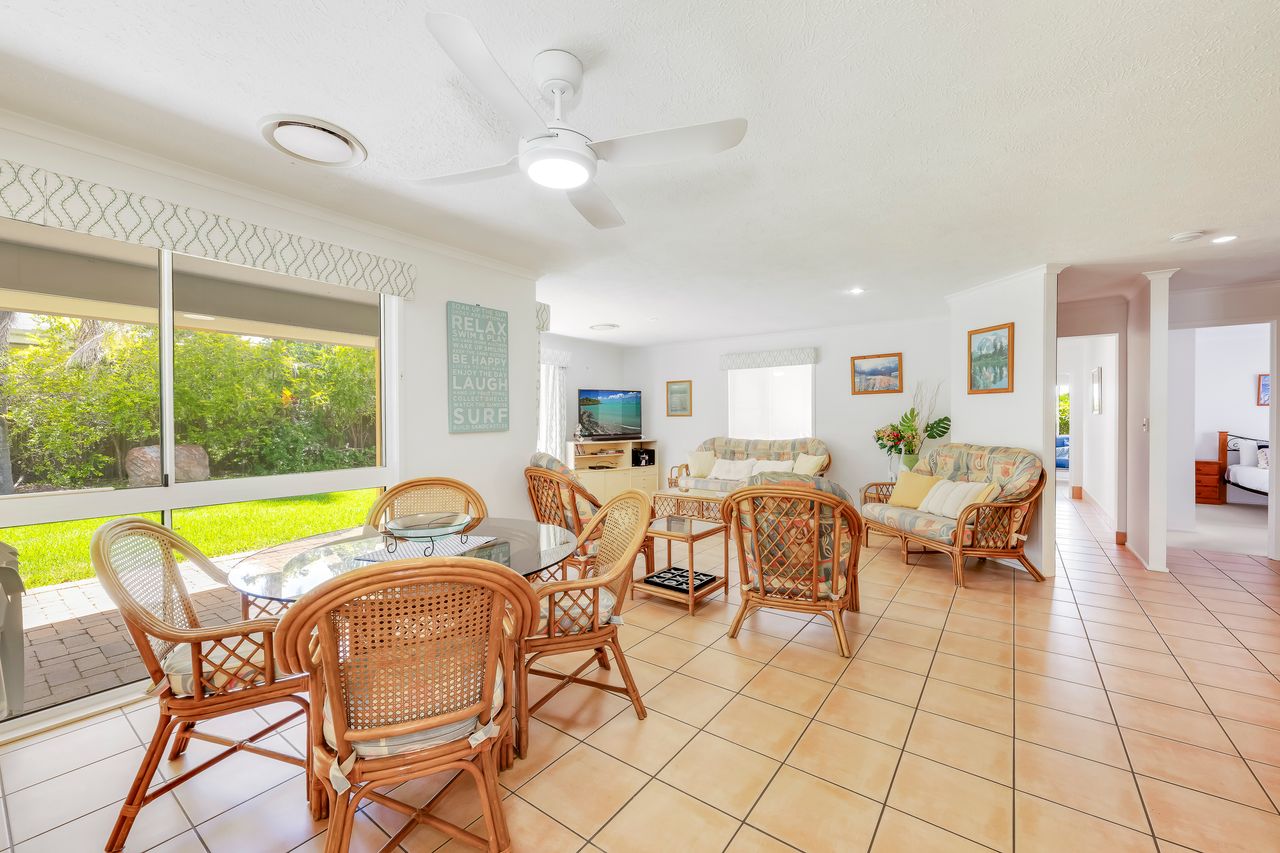 Arguably one of Bargara's best locations! This spacious, stylish family friendly home is set amidst lush gardens on a quite street, a short stroll to Kelly's Beach and Money's Creek, (a swimming lagoon, ideal for small children & those seeking calmer warm waters). Set on one level with with hallways and extensive tiled living areas, this home is easily accessible to the mobility challenged. It is perfectly located for those seeking the best of both worlds; surf, sun, sand, snorkeling and safe swimming, as well as, a quite stylish quality home for those needing a relaxing, stress free holiday.
