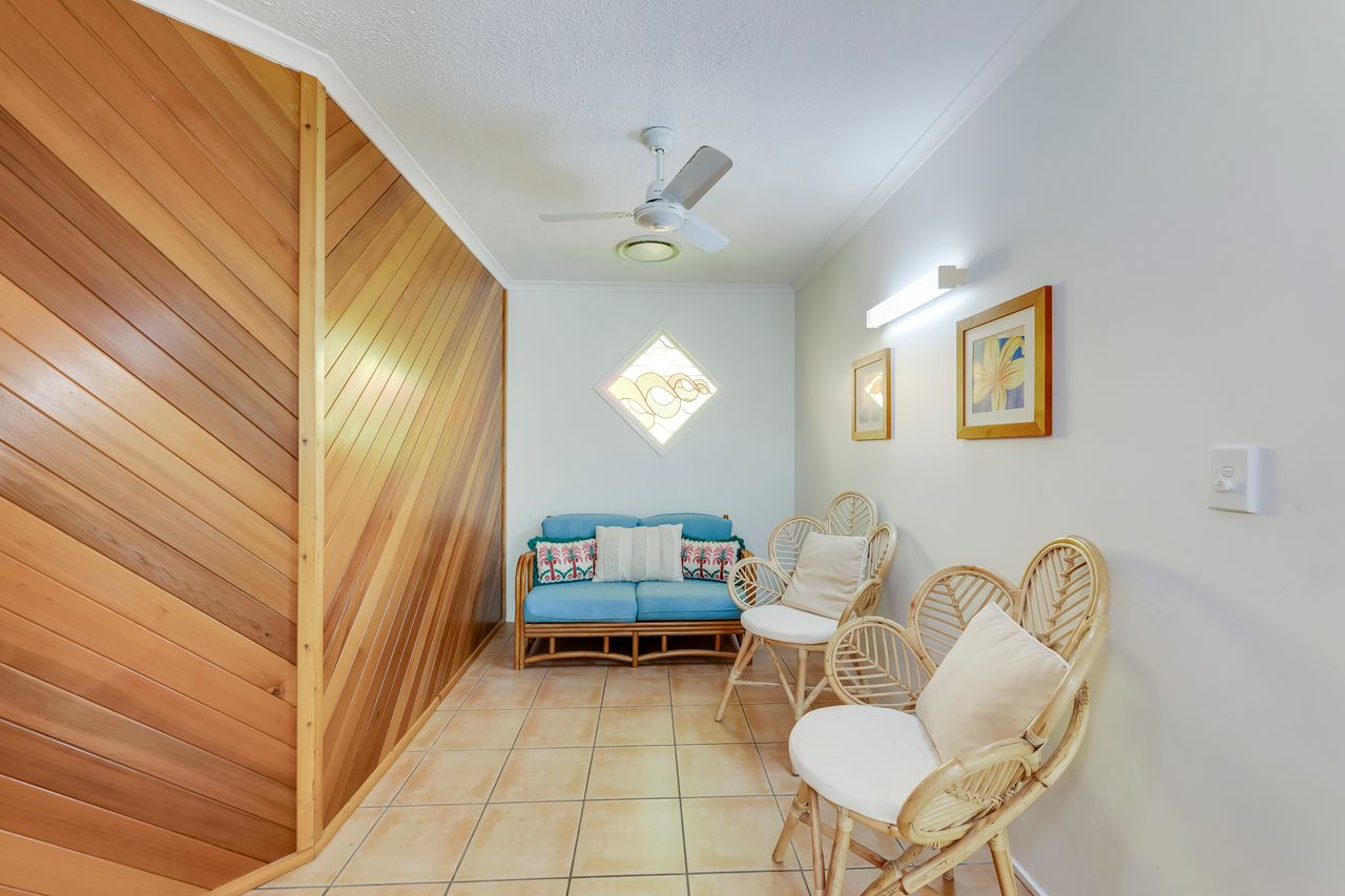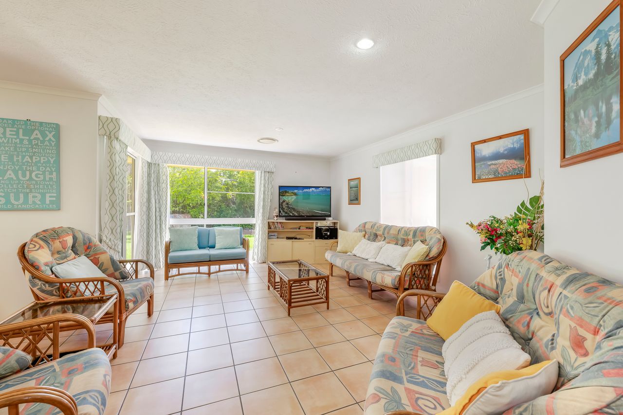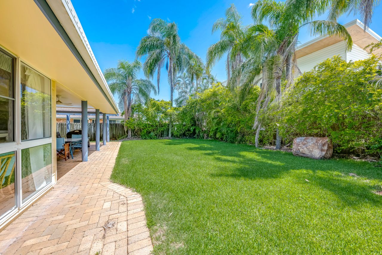 Arguably one of Bargara's best locations! This spacious, stylish family friendly home is set amidst lush gardens on a quite street, a short stroll to Kelly's Beach and Money's Creek, (a swimming lagoon, ideal for small children & those seeking calmer warm waters). Set on one level with with hallways and extensive tiled living areas, this home is easily accessible to the mobility challenged. It is perfectly located for those seeking the best of both worlds; surf, sun, sand, snorkeling and safe swimming, as well as, a quite stylish quality home for those needing a relaxing, stress free holiday.