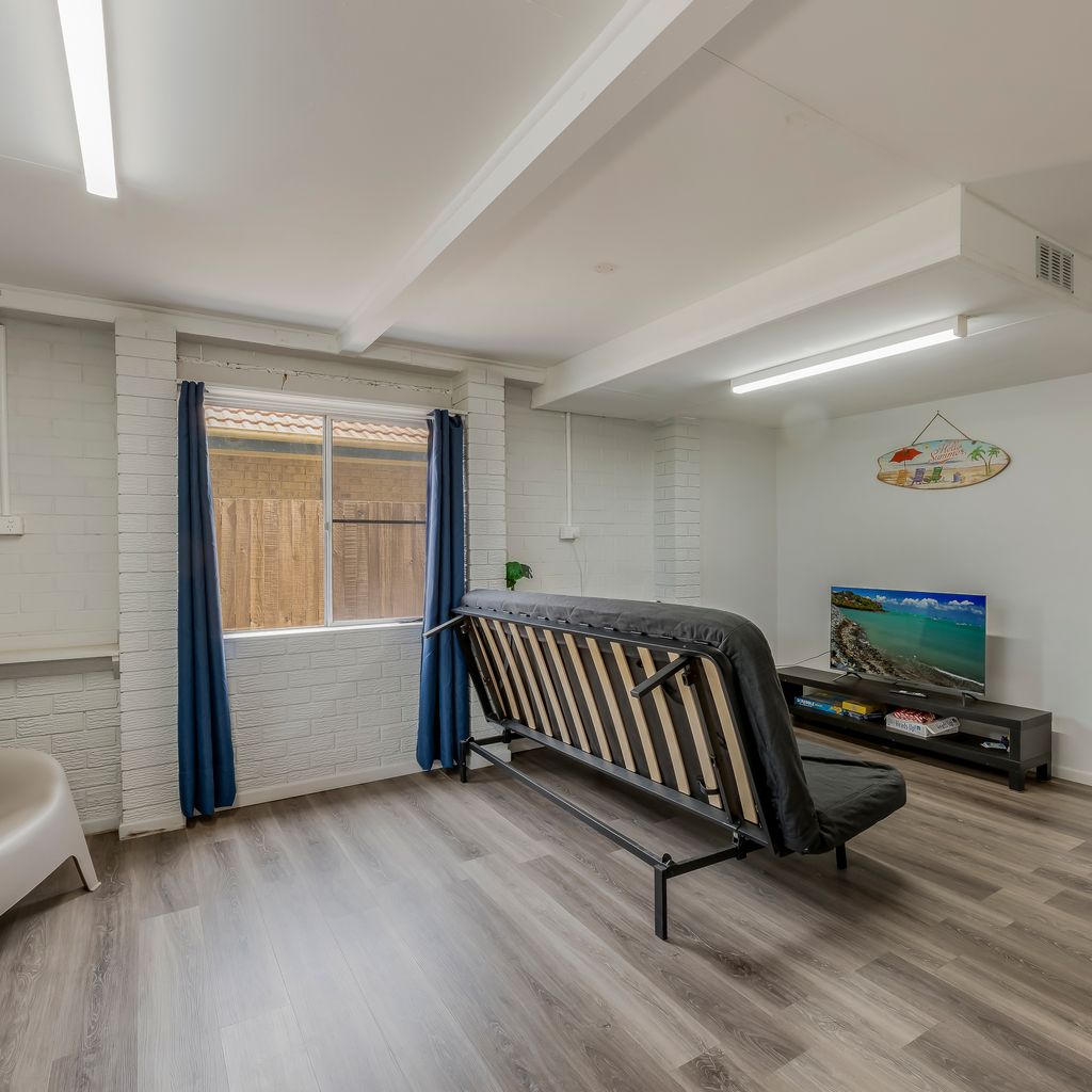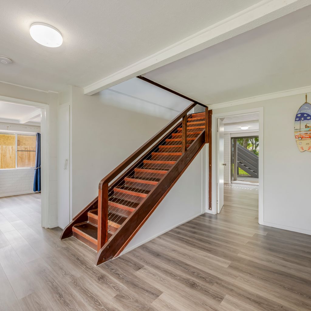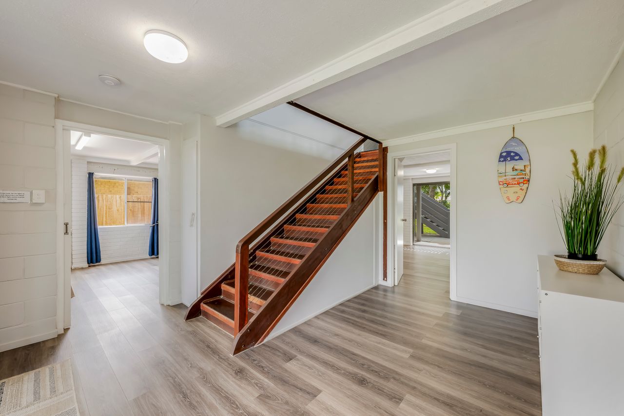 The upstairs level of the home offers a charming deck with partial ocean views and refreshing sea breezes. Inside, you’ll find a kitchen, dining room, lounge, 3 bedrooms, and 1 bathroom. Downstairs features a second bathroom and a large media room with a sofa bed (linen not provided).